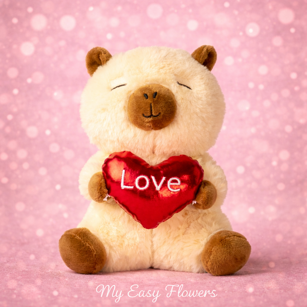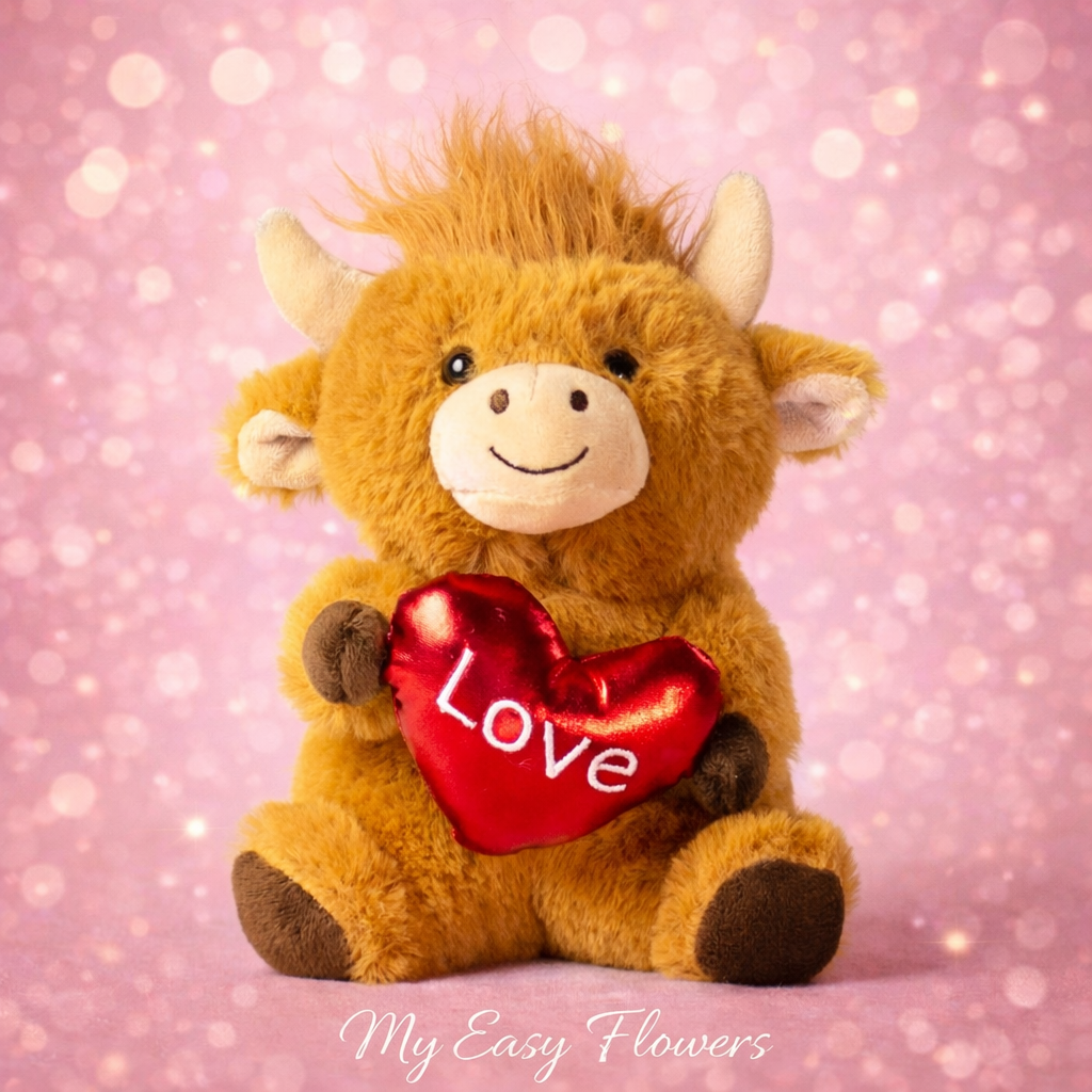 7.5" sitting plush animals. This lovable assortment includes a highland cow, a bright green dinosaur with a rainbow horn, a glittery pink axolotl, and a calm, sleepy-eyed capybara. Each plush pal holds a shiny embroidered heart that says “Love,” making them an ideal fit for Valentine’s Day. Soft textures seated position.